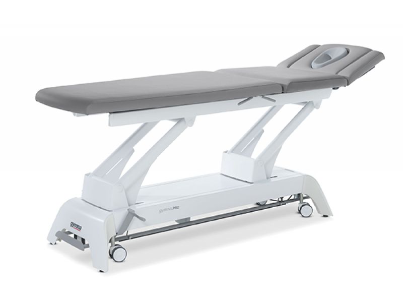 Die 3-teilige Liege ermöglicht Liegen, Sitzen und Kyphose Position, ohne dass der Patient gedreht werden muss. Verbessert die Hygiene, da die Füße nicht auf dem Kopfteil der 3-teiligen Liege liegen. 3-Segment-Liegen werden aufgrund ihrer Flexibilität weit verbreitet in der Physiotherapie eingesetzt. Die Patienten werden in sitzender Position mit Rückenstütze oder in Bauch- / Rückenlage behandelt. Für die manuelle Mobilisierung der Rückenwirbel können die Hüften des Patienten in eine sogenannte Flexionsstellung angehoben werden. Zwar hat die Liege zahlreiche Vorteile, doch besteht der größte Nachteil darin, dass der Patient sich drehen muss, um in die Sitzposition zu kommen. Dies kann umständlich, zeitaufwändig und vielleicht sogar schmerzhaft für den Patienten sein. Der Therapeut muss den Patienten währenddessen häufig stützen. In der sitzenden Position besteht in hygienischer Hinsicht ein Problem, da die Füße des Patienten auf dem Kopfsegment liegen. Die gymna.Pro behebt diese Nachteile mit dem genialen CCP-Konzept, das eine anatomische Anordnung aller Segmente ermöglicht. Der Patient bleibt während der Behandlungen gleich ausgerichtet mit dem Kopf im Kopfbereich und den Füßen im Fußbereich – unabhängig davon, ob er liegt oder sitzt.