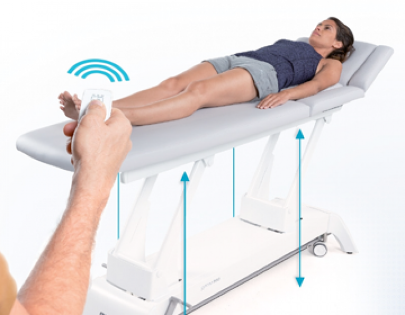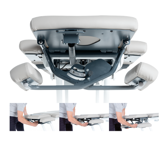 Beide Stützen werden simultan gesenkt, für eine entspannte Nacken- und Schulterregion in Bauchlage. Im Unterschied zu herkömmlichen Armstützen erleichtert das „Ein-Klick“-System die Benutzung. Beide Stützen werden gleichzeitig nach unten verstellt – und das in verschiedenen Schritten. Zusätzlich sind die Stützen leicht geneigt, während sie sich nach unten bewegen, sodass der Patient die Ellbogen leichter nach außen richten kann, was zu einer natürlicheren und entspannten Position führt. Wird das System nicht verwendet, ermöglicht die Ein-Klick-Konstruktion des Systems die für den Therapeuten ungehinderte Durchführung von Therapien wie Kraniosakraltherapie (wobei der Therapeut vor dem Patienten sitzt).