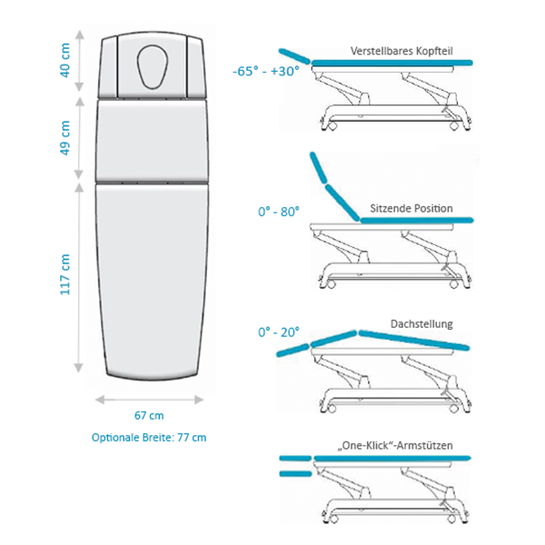 - Große Beinfreiheit unterhalb des Kopfteils bei Behandlung in sitzender Position