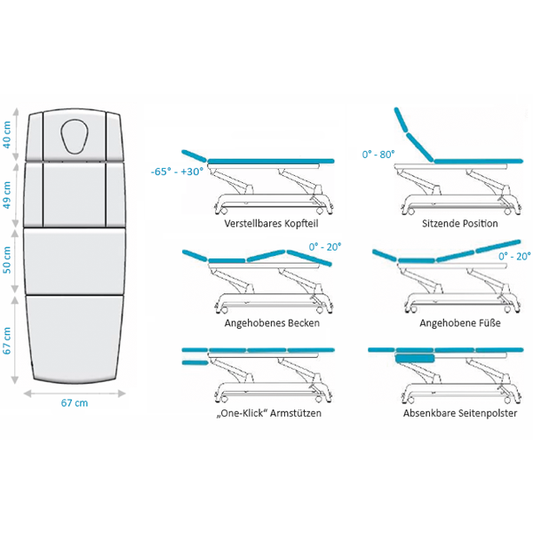 Die Modelle der Gymna.Pro Q sind allesamt mit einem motorisierten Rückenteil, einer motorisiertem Sitz- und Liegeteil sowie einem Motor für die Höhenverstellung (Modell mit i-Control) ausgestattet. Die Verstellung der Polsterung erfolgt bequem und leicht per Tastendruck.