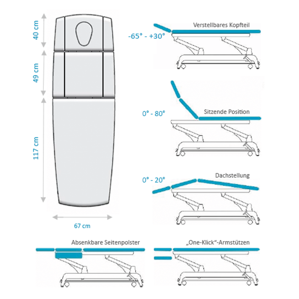 - abklappbare Seitenpolster im Mittelteil der Liegefläche