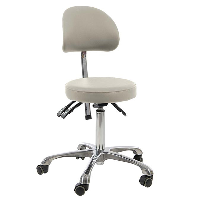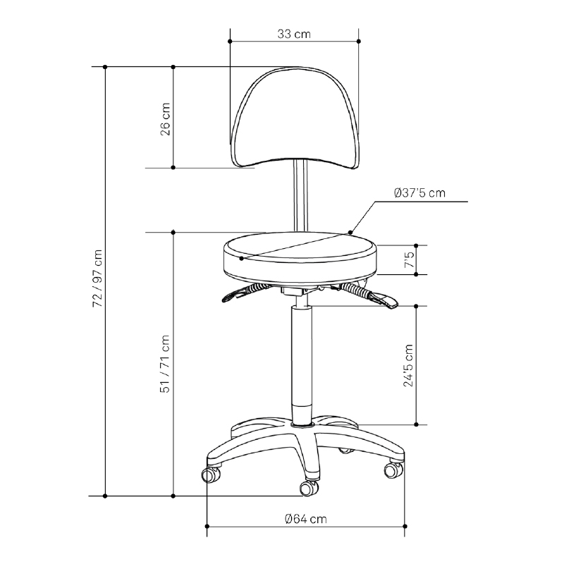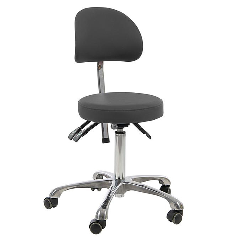 Der Naggura Drehhocker mit Rückenlehne hat eine große Sitzfläche von 34cm Durchmesser und eine Polsterung von 7,5cm Höhe. Die Höhe der Sitzfläche kann mit einem Hebel von 53cm bis auf 73cm verstellt werden, um eine möglichst ergonomische Sitzhaltung zu erlangen. Der Rollhocker hat einen stabilen Standfuß aus edlem Chrom und lässt sich auf fünf robusten Rollen leicht bewegen.